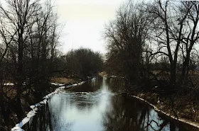 I made this path just by walking on it from our house to the river. Whenever I think of The Cedars, our old home, I think of Trout River. It was a long commute from the city, about an hour and twenty minutes each way for work, but you certainly felt a lot more in touch with nature when you were out there. And the scenery was beautiful; it wasn't stunning or magnificent, but it was beautiful. The Trout River runs across the U.S. border from the Adirondacks, oddly enough an unpolluted river entering Canada from the States, and then in the perhaps ten miles it's in Canada it becomes polluted. Then, just before you reach Huntingdon, the Trout River merges with the Chateauguay River. You wouldn't want to drink the water from the Trout River, but you could swim in it, and it wasn't polluted where we lived except with some run-off from farmers' fields. The only "problem" with the river was that it was very shallow, but this was also a good thing, you could swim in places and enjoy the river, but you could also wade the river. If there was one thing I really loved about this area, where I lived for almost twenty years, it was the river. You couldn't really cross country ski there, the snow blew across farmers' fields and became impacted and icy. I skated a few times on the river, and that was fun. Mostly I'd sit in the summer on a rock in the middle of the river, it was quite narrow (maybe twenty or thirty feet wide where we lived) and read and write poems. Or walk down to the river, it was maybe a hundred feet behind the house, and stand by the river and enjoy being there.