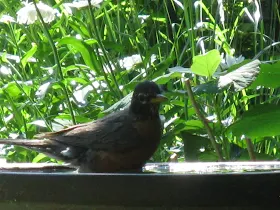 I never throw out any plants, I just begin a new area to garden, so I conserve what I have and increase it. I wanted a traditional cottage garden, a garden where my grandmother would feel at home if she could visit. I am not opposed to grass and lawns but it isn't at the top of my gardening priorities; last year I extended the perimeter of the garden and I plan to enlarge the garden as long as I have surplus plants or go out and buy more. I am now thinking of islands; for instance, where I have the bird bath which also has hostas and a hydrangea beside it. As for plants, free or a gift is always best for adding to the garden; I like an anecdote, the human element, to go with a new plant. A few years ago I found what might be hostas that I hadn't planted, a sumac appeared this year, and ground cover has migrated from a neighbour's yard. When I began this garden I decided to grow only perennial flowers, daisies, day lilies, irises, ornamental grass; I also have lilacs, raspberry canes, and roses left by the previous owner from twenty-five years ago. I have a few pots planted with annuals and I've had pots for many years; it's a good quick way to have a garden in places where otherwise there would be no garden. I like hanging baskets of flowers. I collect rain water and water and dead head flowers every day. Visiting gardens can be like looking at photos of someone's vacation, even I gave my mother's garden a more or less cursory visit, and she worked hard on that garden with plants that she had returned with from visiting relatives in Woodstock, ON; for instance, rhubarb from Ruth Laflare; now I wish I had some of her plants, they would mean a lot to me. This year has been exceptional, hot, rainy, and the garden has flourished. In the evening fire flies are everywhere, a few days ago the hummingbird moth appeared in the bee balm, honey bees in the cone flowers, big bumble bees and the occasional skunk passing through, and so on. And if you sit quietly there are birds in the bird bath, they have a great time splashing around, completely submerging themselves in water. When I open the gate I leave behind the noises of the street and I think to myself, this is like the Garden of Eden!